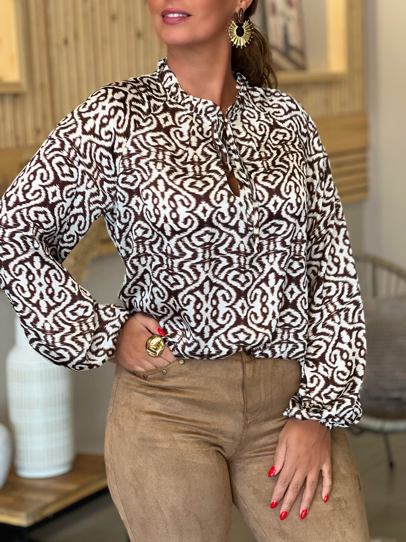 Caractéristiques : décolleté en V, noeud à nouer à l’avant au niveau du cou