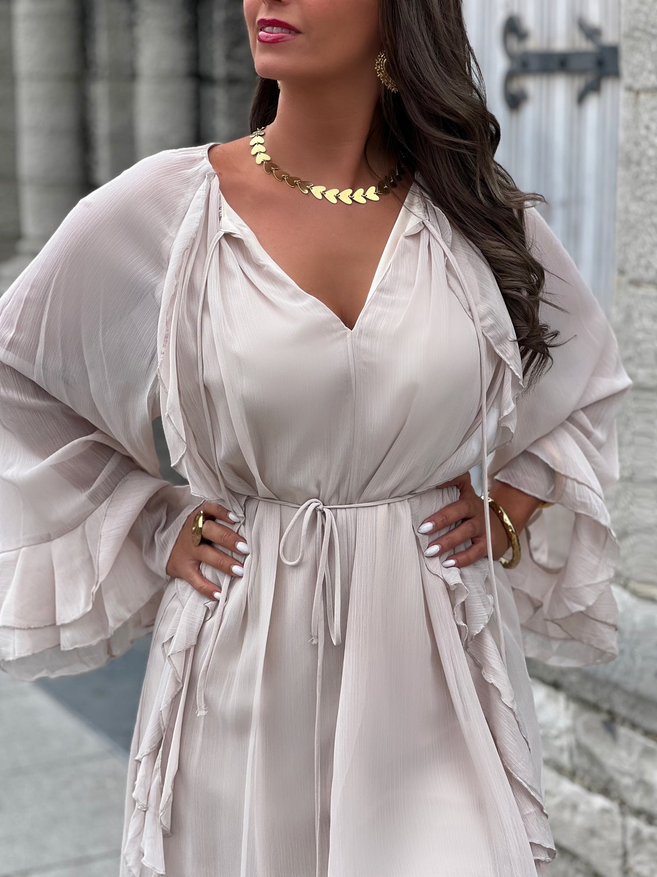 Caractéristiques : décolleté en v, doublée, robe à volants